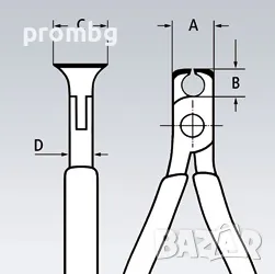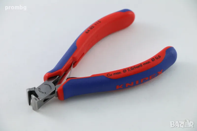 Knipex челни резачки за електроника и фина механика 115 мм, KN6402115, немски, внос от Германия. Прецизна пружина, която позволява плавно отваряне. Клещите са изработени от висококачествена инструментална кована стомана, закалена в масло. Всички режещи ръбове са допълнително закалени до 56 HRC. Дръжките са от двукомпонентна гума. Възможност за рязане на меки материали до 2,0 Ø mm и на твърди материали до 0,6 Ø mm. Тегло 100 гр.