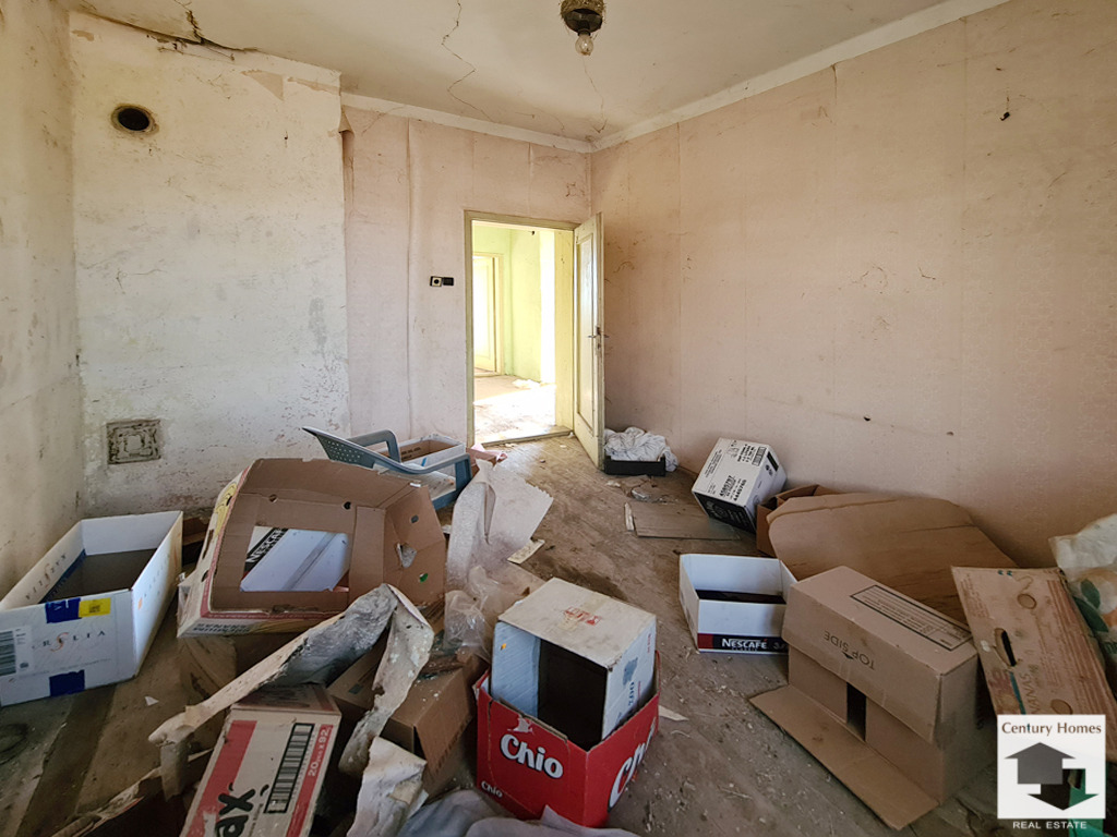 Приземното ниво включва кухня, стая и маза. Тук е необходимо обновяване, включително поставяне на нови подови настилки, шпакловане на стените и изграждане на вътрешна баня с тоалетна, тъй като в момента липсва. Вторият етаж е достъпен по външни стълби и се състои от три спални и килер. Това ниво е в по-добро състояние и има потенциал за лесно обновяване и обитаване.