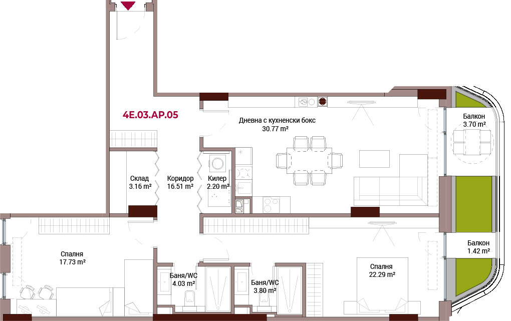 Просторен апартамент 4E.03.05 в иновативен жилищен комплекс Vitosha Art, проектиран от международни архитектурни студиа (Benoy и ML Studio Лондон).