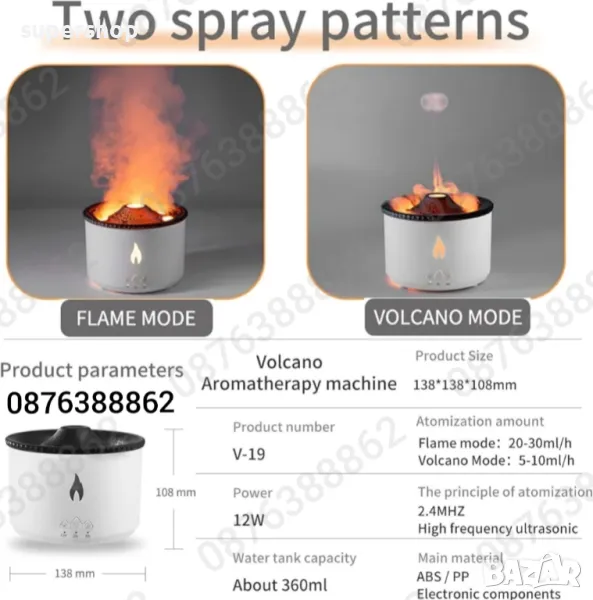Оригинален ефект на пламък и вулкан: Двата режима са пламък и вулканична медуза. Пламъците горят във въздуха като мъгла, моделите на вулканични медузи излъчват мъгла като вулканични изригвания и изскачат от кратера като медузи, носейки ви приятни аромати.