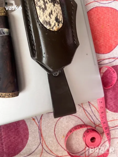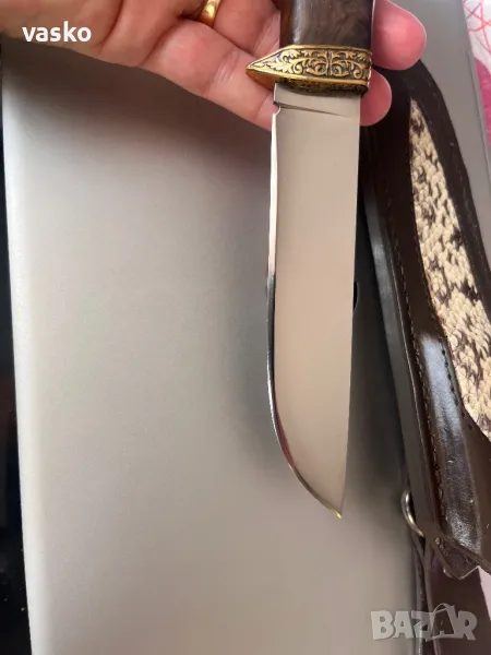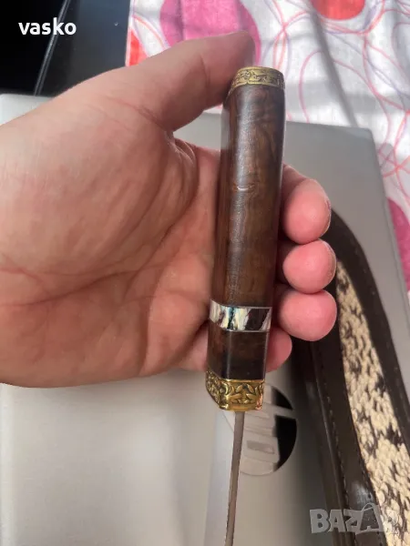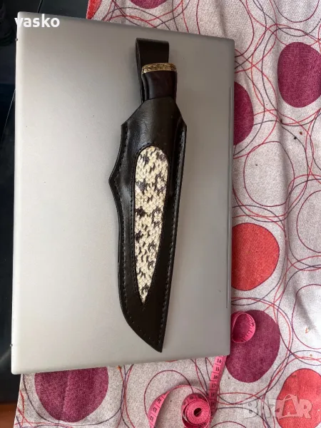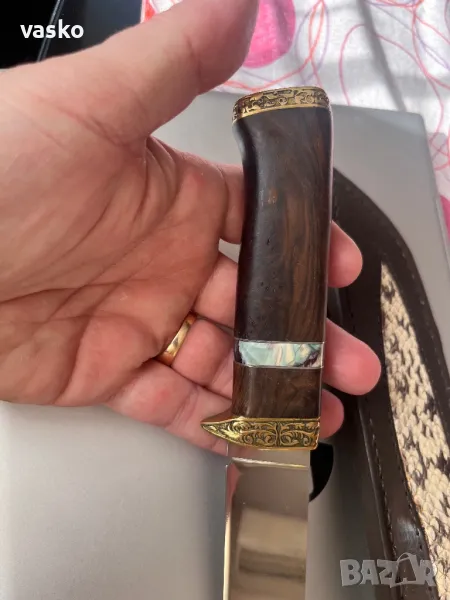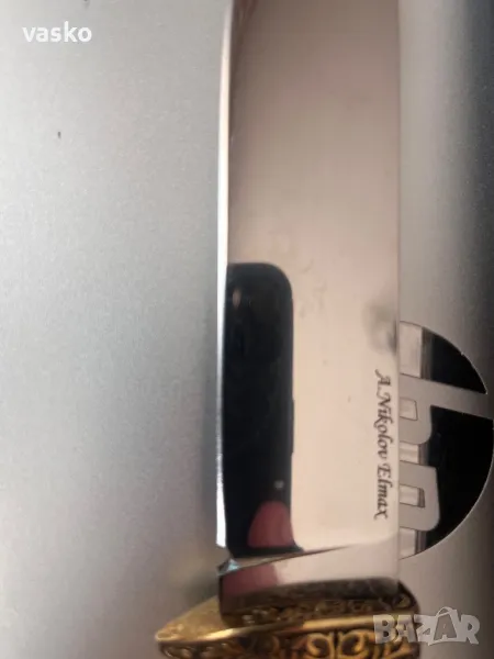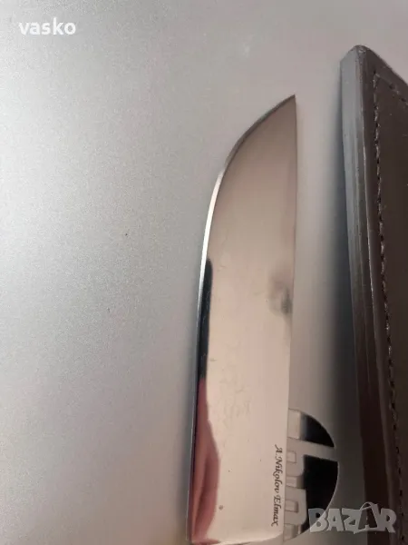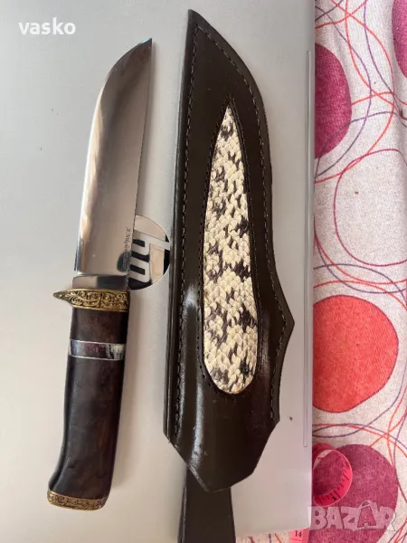 ножа от снимките те-Стомана Елмакс.дръжка стабилизирана дървесина и пръстен бивна от мамут,гард и пета месинг,кания естествена кожа и апликация от змийска кожа,ръчна изработка,перфектен,нов,никога не е ползван-стои си в канията в шкафа,купувал съм го нов от майстора преди време.Продава се защото не се ползва.Изработен англ А.Николов-маркиран.Обща дължина 26.5см,дължина на острие 14см,дебелина на острието при дръжката 3мм,закален на 61 еденици.