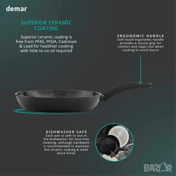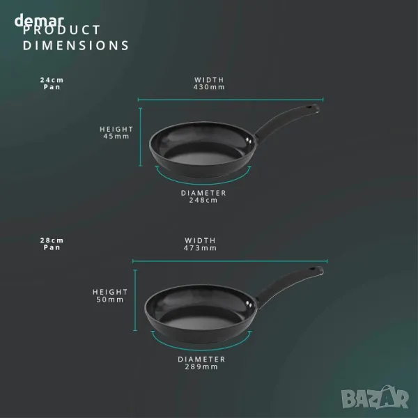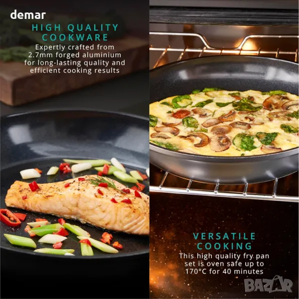 Този комплект тигани от 2 части включва тигани с размери 24 см и 28 см, идеални за разнообразни готварски нужди като палачинки, яйца и сотирани зеленчуци. Изработени от издръжлив 2,7 мм кован алуминий, тиганите са устойчиви на изкривяване, разпределят равномерно топлината и гарантират дълготрайно качество. С керамично покритие без токсини, което е 5 пъти по-здраво от традиционните незалепващи повърхности, те предлагат по-здравословно готвене с минимално масло и са съвместими с найлонови, дървени или силиконови прибори. С устойчивост на топлина до 170°C за 40 минути, те безпроблемно преминават от котлон към фурна за допълнително удобство.