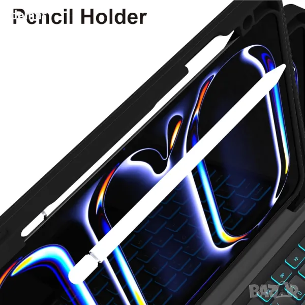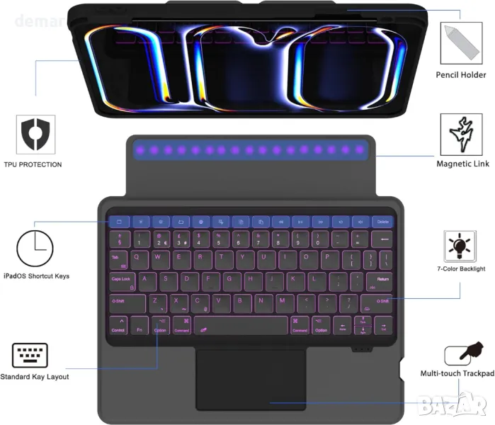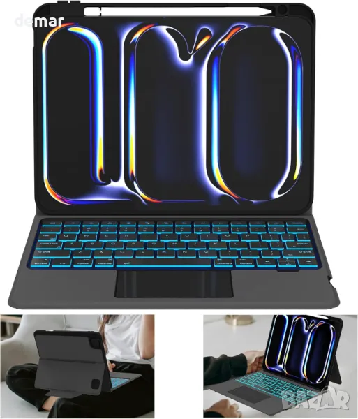Съвместим изключително с iPad Pro 11-инчов M4 2024, този калъф разполага с вграден слот за молив и подвижна магнитна клавиатура за безпроблемно изживяване, подобно на лаптоп, идеален за пътуване, офис или училище. Дизайнът 2 в 1 съчетава кожен предпазен калъф с подвижна клавиатура, която се прикрепя магнитно, предлагайки гъвкавост и преносимост. Британската QWERTY клавиатура включва мултитъч тракпад за прецизна навигация и подобрена продуктивност. Със 7 цвята на подсветката и 3 нива на яркост, писането в тъмна среда е лесно и приятно. Регулируемата стойка осигурява множество ъгли на гледане, докато интегрираният държач за молив осигурява сигурно съхранение.
