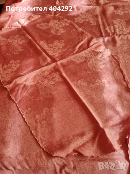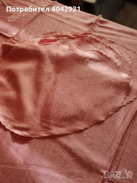 Розова памук и коприна.Може за кръгла маса,елепса и правоъгълна.Размер ширина 160/180 дължина.Подложки за сервиране 6 броя и една за средата на масата по голяма.Размер на малките подложки 40/30, голямата 61/36.Има фабричен дефект на гърба на покривката който също съм снимала.Първо гърба и после лицето.