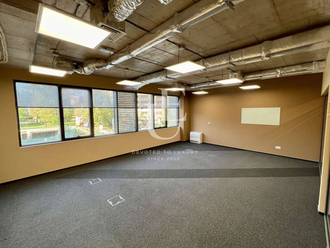 ? Под двоен под изпълнен с пана 60х60. В офисното пространство е покрит с висококачествен пожароустойчив мокет. Комуникационното помещение е завършено с антистатична настилка. Кухненски кът е завършен с ламинат.