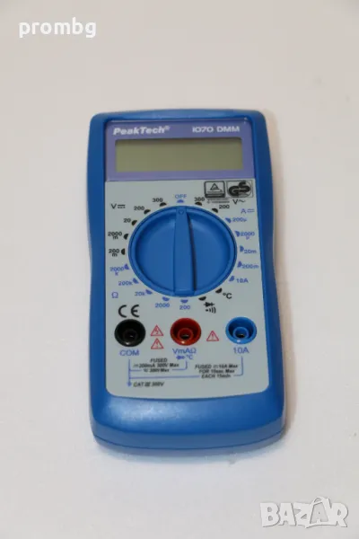 мултицет Peaktech ,4 цифри, стандарт TÜV, нов, немски, внос от Германия, високо качество. 4-цифрен, 12 mm LCD дисплей, макс: 199 измервания на ток до 10 ампера постоянен ток; опция за проверка на диоди; измерване на температура. Приложени аксесоари:2 сонди, термодвойка /сонда за измерване на температура/, батерия и ръководство. Постоянно напрежение /DC/: 200 mV/2000 mV / 20V/200V/300 V; Променливо напрежение /CV: 200 V/300 V; Постоянен ток /DC: 200mA/2000 / 20mA/200 mA / 10 A; Измерване на съпротивление: 200 Оm/2000 Om / 20/200/2000 Kom; Звукова сигнализация за проверка на електрически вериги. Температура 0-1000 ° C; захранване: 9-V батерия /вкл в комплекта/. Размери (Ш х В х Д): 70 х 140 х 30 мм. Тегло 220 гр. Изпращаме с Еконт