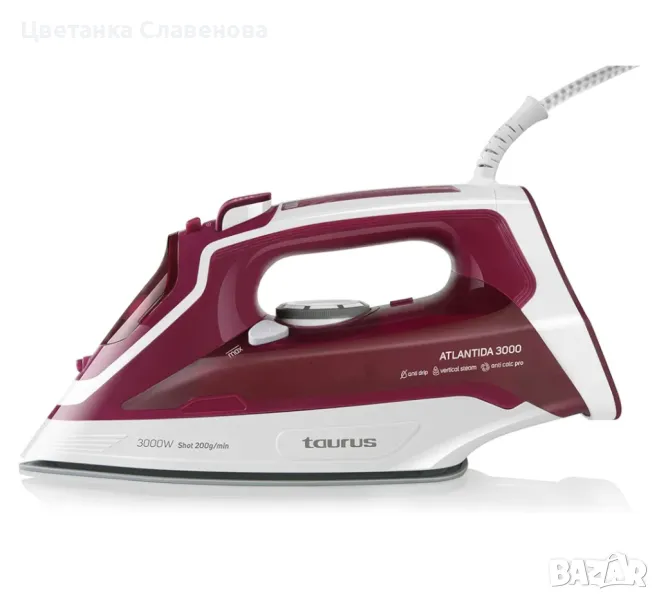 Парна ютия Taurus Atlantida 3000, 3000 W, парен удар 200 g/min, постоянен парен удар 45 g/min, керамика, функция за пръскане, двойна система за котлен камък, самопочистваща се, без капки