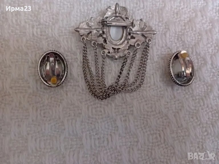 Комплекта се състои от брошка със стрази и перла. Обеци с перли и клипси
