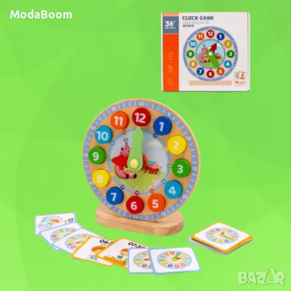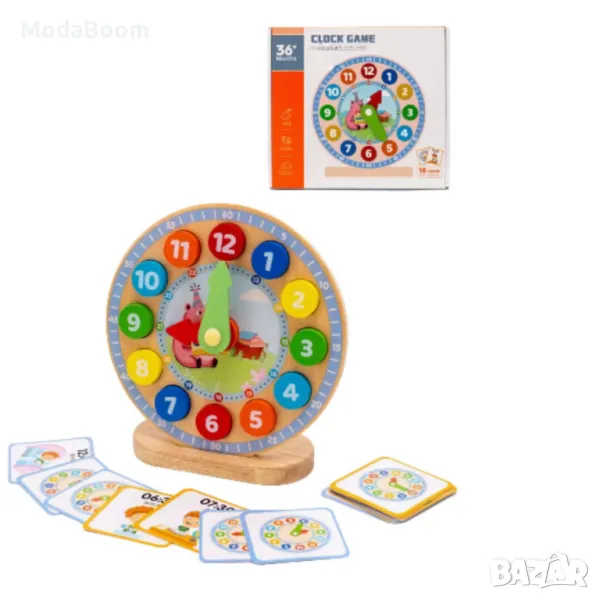 Дървеният сортер с часовник е забавна и образователна игра, която помага на децата да развиват логическо мислене, координация и разпознаване на форми и цветове. Играчката включва 18 образователни карти, които предоставят различни задачи и предизвикателства, свързани с времето и основни математически операции.
