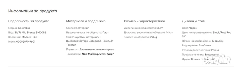 Обувка в уличен стил с дух на открито, тази обувка е готова за всичко благодарение на удобната текстилна горна част, годна за носене през целия ден и здраво сцепление. Проектиран за удобство и топлина като при чорап, това е перфектната ежедневна обувка. Мъжките обувки SH/FT Mid Breeze са заредени с модерна технология и вграденото внимание към детайла на Columbia. Тези здрави градски трекери разполагат с гъвкава текстилна горна част, която се вписва в дишаща външна част, предназначена да поддържа краката ви топли и сухи в града или през пътеки. Те разполагат с лека междинна подметка, която осигурява дълготраен комфорт, превъзходно омекотяване и висока възвръщаемост на енергията. Те се движат върху нашата външна подметка Omni-GRIP за всякакви терени и завършват с високи връзки за правилна опора на глезена - обувка, която изглежда страхотно навсякъде в движение. Columbia предлага тези мъжки обувки в множество цветове, отговарящи на размера.