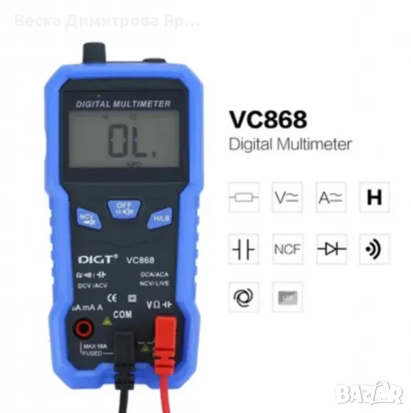 Функции: DC/AC напрежение, DC/AC ток, Съпротивление, Капацитет, Диоден тест, Тест за непрекъснатост, NCV тест (безконтактно откриване на напрежение), Автоматичен обхват, Задържане на данни, Защита от претоварване, Автоматично изключване, Фенерче;