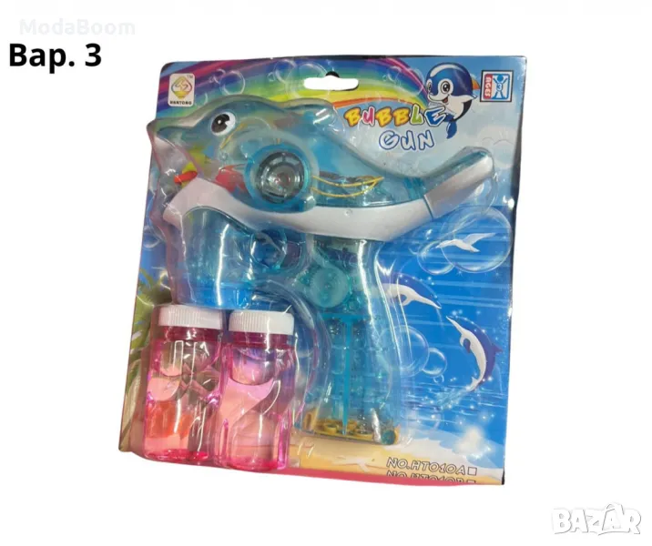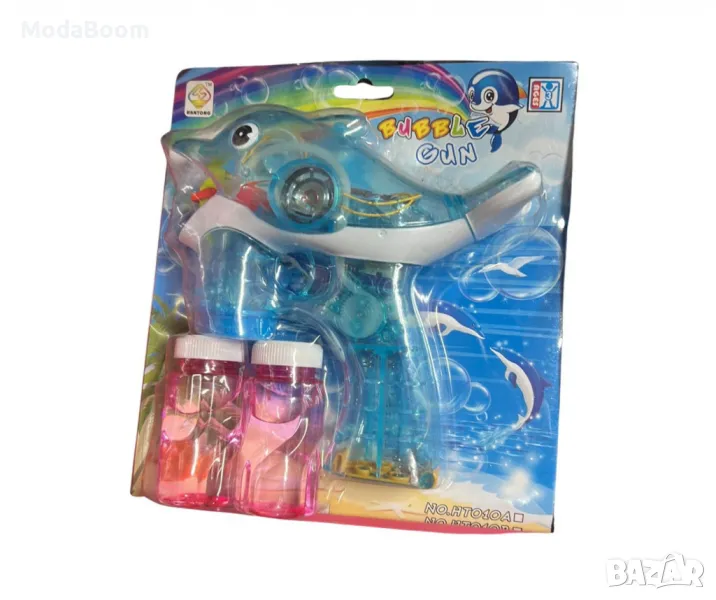 Пистолет за водни мехурчета с размери 15 см, оборудван с два резервоара за сапунена вода. Подходящ за деца, предлага се в три различни варианта: син, оранжев и с форма на делфин. Създава множество забавни мехурчета и осигурява часове радост и развлечение на открито или вкъщи.