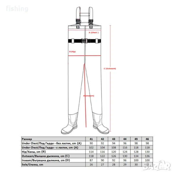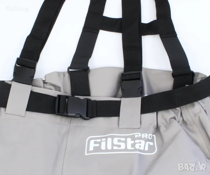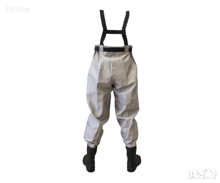 Висококачествен дишащ панталон с ботуши, който ще ви осигури удобство по време на вашите риболовни приключения. Изключително здрав и устойчив на износване, с удобна и широка кройка. Панталонът е снабден с регулируеми ластични презрамки, които са здраво фиксирани към него с велкро и могат да се отстраняват по желание. Водоустойчиви PVC ботуши с противохлъзгащ грайфер, които ще ви осигурят максимален комфорт при газене през целия ден. Разполага още с вътрешен джоб с цип, регулируем колан и се доставя в удобна непромокаема торбичка с връзка.