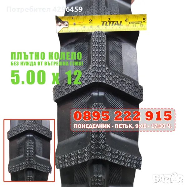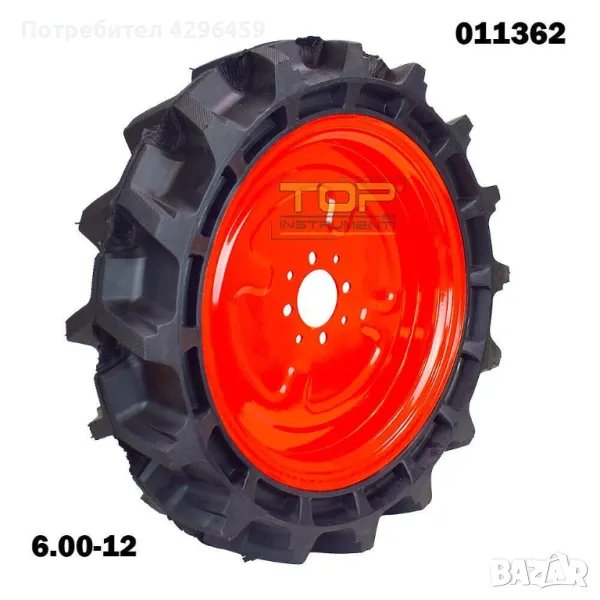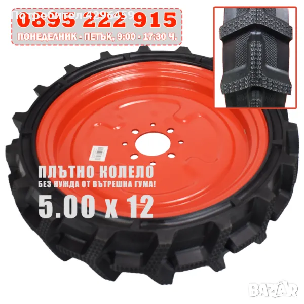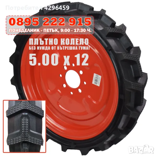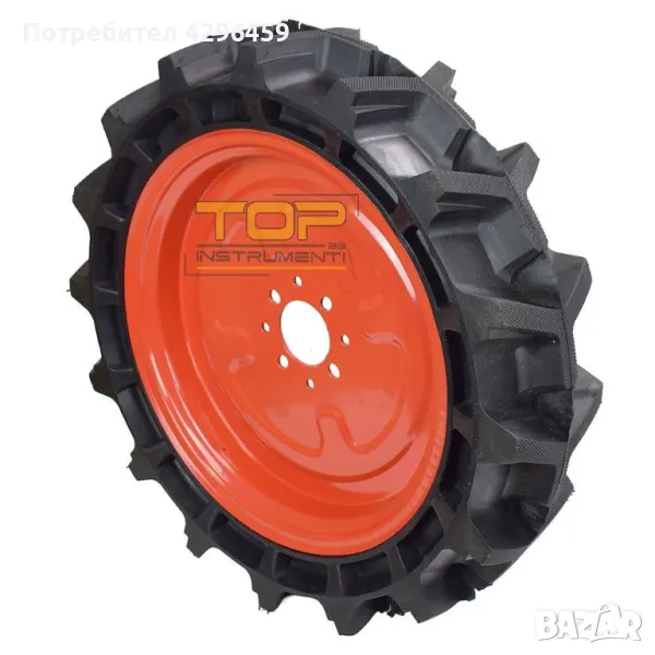 Колелото е плътно и не се нуждае от вътрешна гума или надувана. Няма пукане, няма спадане. Перфектно както за мотофрези и мотоблокове, така и за ремаркета и малки трактори.