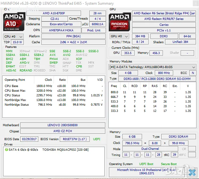 Лаптоп Lenovo Thinkpad E465 AMD A10-8700P / 6GB RAM / 320GB HDD