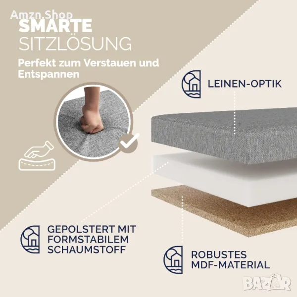 300 кг товароносимост: капакът и рафтът, тясната пейка за ракла са изключително дебели и по този начин предлагат макс. Статична товароносимост 300 кг. Създайте стилен ред в дома си с новата си кутия за сядане в бежово, черно, бяло, кафяво или сиво.