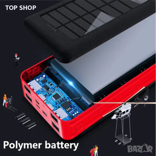 Банката за захранване е изработена от черна огнеупорна пластмаса, има интересен стилен външен вид, така че не е срамно да я носите със себе си. Снабден е с 4 USB порта с възможност за едновременно зареждане на 2 устройства. Характерна особеност е наличието на type-c micro-usb и Lightning входни конектори, както и соларен панел за зареждане.