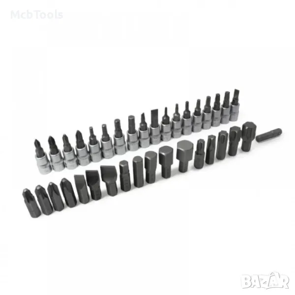 - 18 броя 1/4 бит: SL4, SL5.5, SL6.5, PH1, PH2, PZ1, PZ2, HEX3, HEX4, HEX5, HEX6, TORX T8, T10, T15, T20, T25, T27, T30