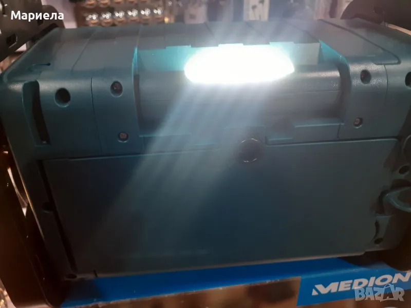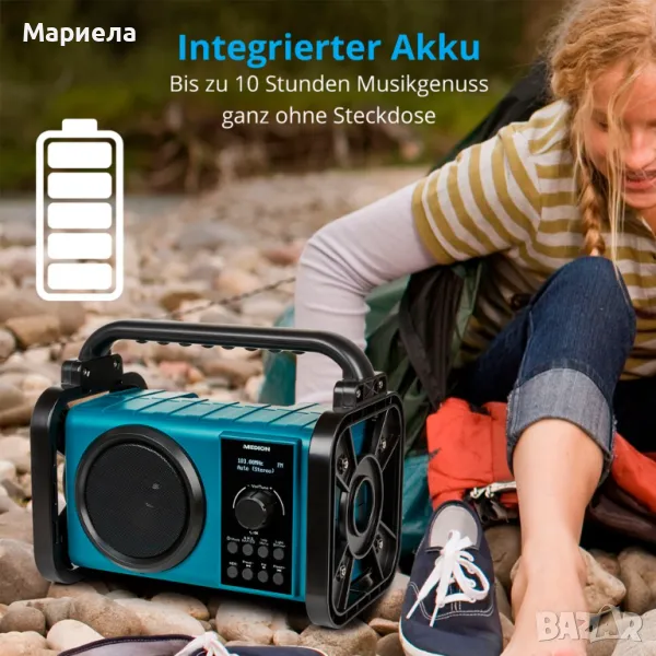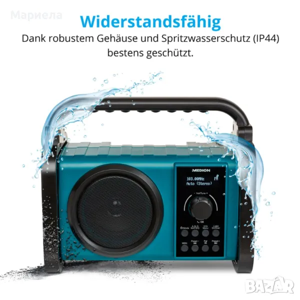 Независимо дали сте на къмпинг в гората, на езерото в кариерата или на строителната площадка: Слушайте любимата си музика навсякъде с устойчивото на пръски радио MEDION LIFE MD46200. Със своя сертификат IP44, той е особено здрав и може лесно да издържи на пясък или пръски вода. Радиото няма да ви остави на тъмно, тъй като има LED работна светлина и е готово за използване по всяко време. Можете да го управлявате от електрическата мрежа или с вградената литиево-йонна батерия, която предлага до 10 часа време за възпроизвеждане на музика.