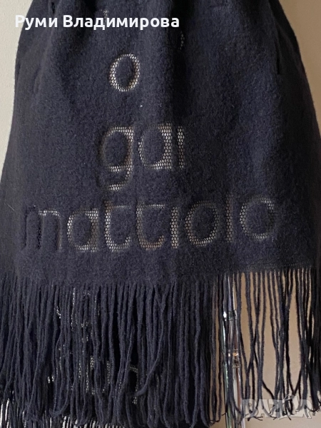 Черен шал Gai Mattiolo/ голям шал тип одеало, целия брандира с прозиращи материята букви на марката лакто и с цялото й име във двата краища хоризонтално, с дълги ресни, липсва етикет за състав, но според мен е смесена материя с вълна в нея, висок клас Италианска, винтидж марка, размер 110 X 189 см. Доставка с Еконт.