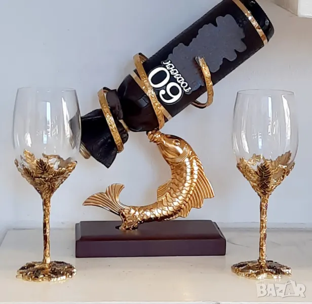 Уникален комплект от две бутикови чаши за вино изработени от кристал и месинг - изкустно съчетание на метал и кристал, златна икона с Богородица, и юбилейна бутилка декорирана с кожа във формата на торбичка, златни цифри 50 години, и дървена плочка с оригинално пожелание.