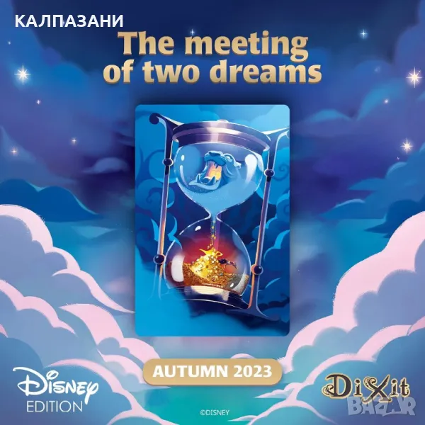 Dixit: Disney е нова самостоятелна игра от вселената на Dixit, която е вдъхновена от любимите филми на Disney и Pixar. Играчите ще бъдат предизвикани и възхитени, докато разкриват поредица от карти с прекрасни тематични изображения.