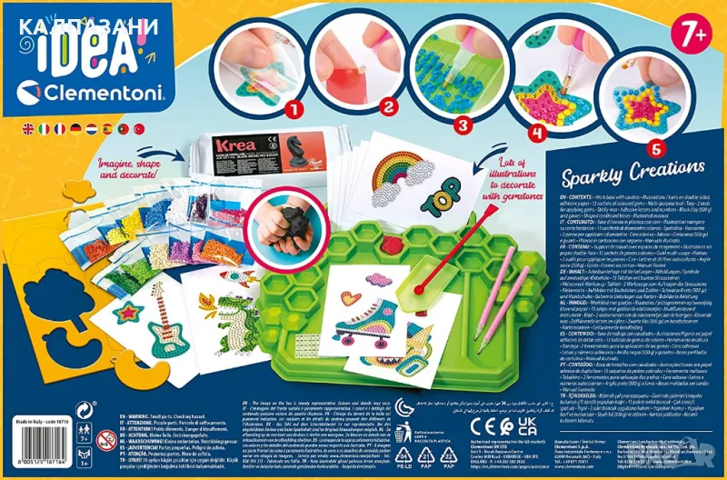 Творческият комплект от Clementoni ще се хареса на всички малчугани, които обичат да създават и да творят. С него те ще развиват въображението и фината си моторика, докато се забавляват. Практичният органайзер ще им помогне да държат всичко на едно място, а благодарение на цветния шаблон и специалната писалка, 3D камъчетата се нанасят лесно. След като картините са готови, те се превръщат в стикери - отлепете от хартията и залепете на желаното място. В комплекта е включена и глина, която децата могат да моделират в каквото пожелаят и след това да го декорират със стикерите.