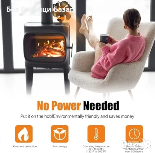 Без електричество – задвижва се от топлината на печката, намалява разхода на дърва с до 38%