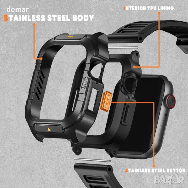 Изработен от издръжлива неръждаема стомана 316 с подплата от TPU, този калъф с каишка за Apple Watch предлага цялостна защита с повдигната рамка за предпазване от удари и драскотини – идеален за взискателни работни среди. Прецизните изрези осигуряват пълна функционалност, позволявайки гладка работа на бутоните, екрана и короната. Проектиран със смели ултраоранжеви акценти, той добавя стил, като същевременно е подходящ за ежедневно носене, тренировки и дейности на открито. Меката силиконова гумена каишка разполага с усъвършенствана вентилационна система за подобрен въздушен поток и дълготраен комфорт. Регулируем, за да пасне на китките от 15 до 20 сантиметра, той е съвместим с Apple Watch Series 6/5/4/SE/SE2 (44 мм).