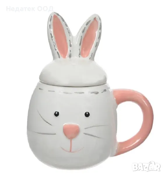Великденска чаша, бяла керамика с 3D дизайн на зайче с розова дръжка, върти и капак с розови уши.