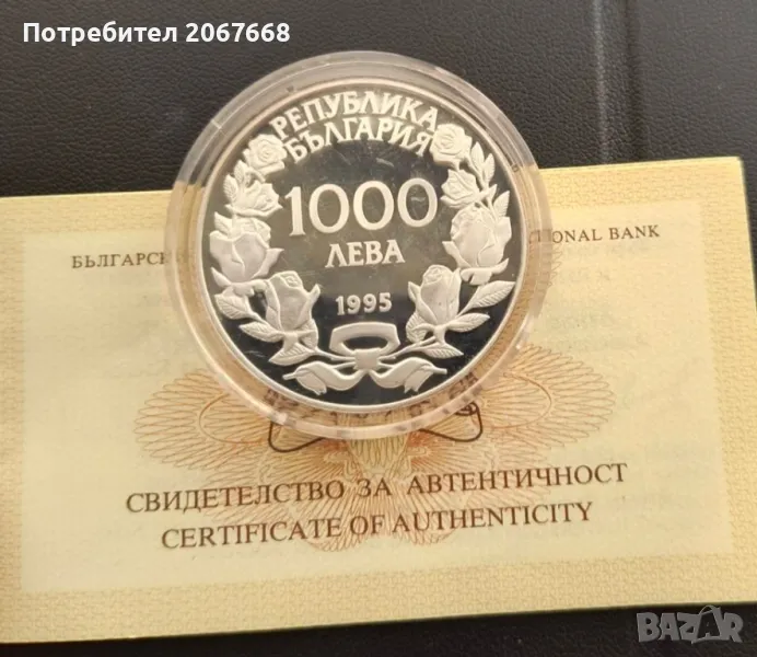 1000 лева 1995 година " 100 г. олимпийски игри, 1996 г.". Нециркулирала сребърна монета със сертификат. Забележките са по капсулата.