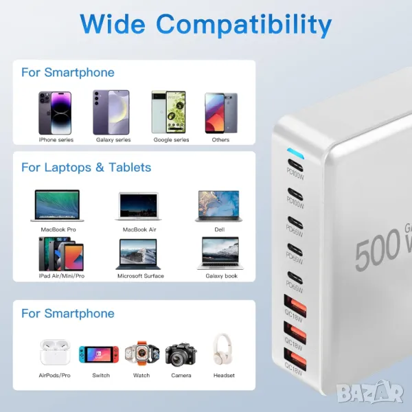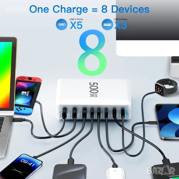 USB C зарядно устройство 500 W, 8 порта GaN3 USB C зарядна станция