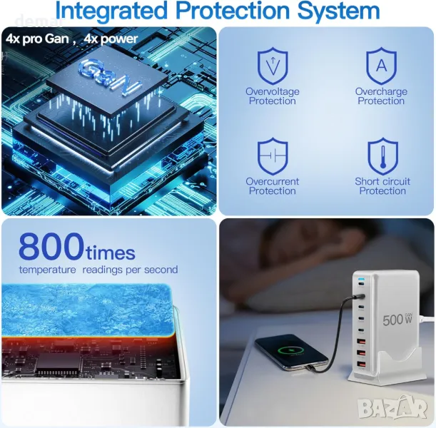 Това 500W USB-C зарядно устройство осигурява бързо зареждане с ефективна доставка на енергия, осигурявайки оптимални скорости за съвместими устройства. Неговият компактен и преносим дизайн го прави идеален за пътуване или използване на настолен компютър. Снабден с 5хUSB-C и 3хUSB-А портове, той поддържа както пренос на енергия, така и синхронизиране на данни. Вградените функции за безопасност предпазват от свръхток, прегряване и късо съединение за надеждна работа.