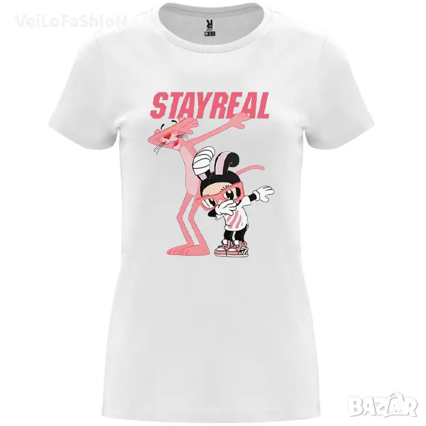 Новa дамска тениска в бял цвят с Пинко Розовата Пантера - STAY REAL. Произведена от 100% памук с плътност на тениската 170гр./м². Тениската е с двуслойно деколте, странични шевове и подсилено двойно покритие на шията и раменете. Подходяща както за ежедневна употреба, така и за спорт или тренировка в свободното време.