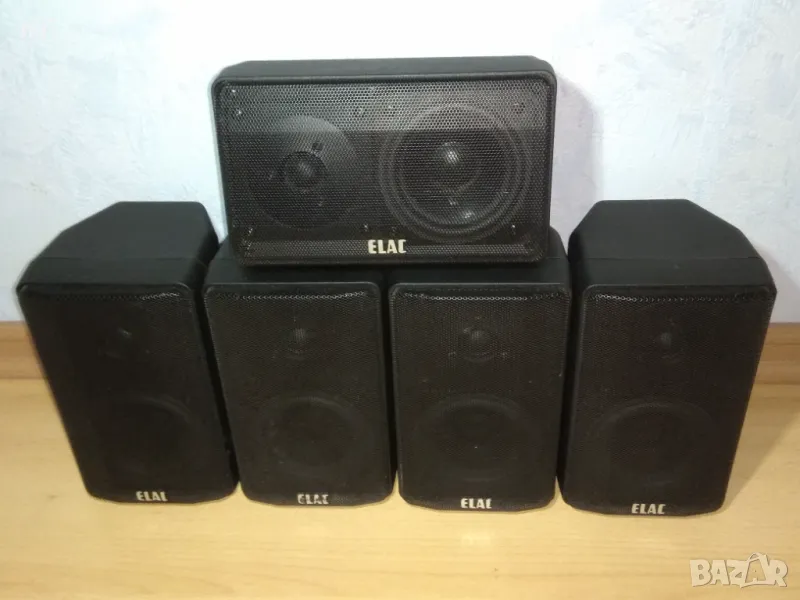 5 броя двулентови тонколони Elac Cool. В много добро състояние , технически отлични. Габаритни размери : в.21см, ш.12,6см, д.14,2см. Номинална мощност 40w, импеданс 4ohm, честотна лента 60Hz-23kHz, чувствителност 88dB. Произведени в Германия.
