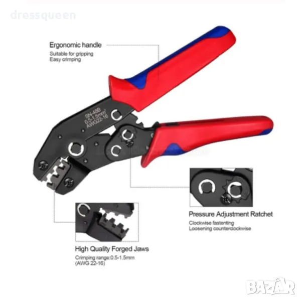 Клещите за кримпване SN-48B са висококачествен инструмент, предназначен за надеждно и лесно свързване към кабелни обувки и конектори.
