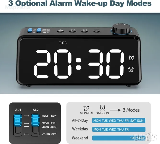 Позволява ви да зададете 2 отделни аларми за вашите различни нужди и може да бъде програмирана да работи само през делничните дни, през уикенда или всеки ден от седмицата. А часовникът разполага с 2 събуждащи- звуци (бипкане и радио), така че е подходящ за всички хора като тийнейджъри, ученици и възрастни хора.