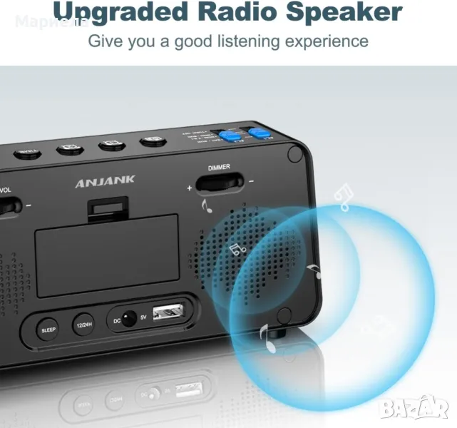 Радио будилникът с честотен обхват от 87,5-108MHz. Можете лесно да настроите и запазите любимите си радиостанции. С първокласен високоговорител с регулируема сила на звука можете да се насладите на чист звук. Има и сън таймер от 10 до 150 мин. Удобна допълнителна опция. 6,5" ГОЛЯМ LED ДИСПЛЕЙ и 0-100% ДИМЕР: С 6,5-инчов дисплей, голям и бял ясен номер на дисплея и колело за контрол на пълен обхват, поставено на гърба за регулиране на яркостта, е лесно да четете часа през деня и нощта , нито прекалено светло, нито твърде слабо, за да се види.