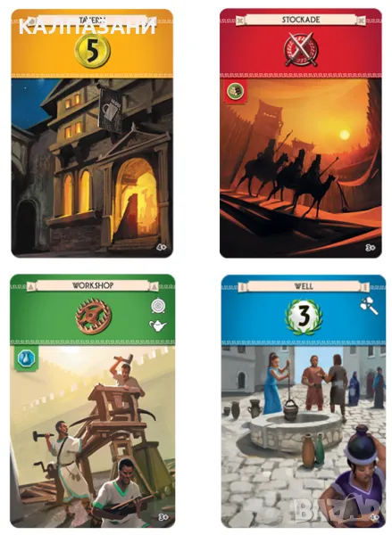 В настолната игра 7 Wonders (Second Edition) ще се запознаете с някои от древните архитектурни чудеса на света. Играта е стратегическа и се играе с карти. Първоначално всеки играч получава игрално поле – едно от чудесата на света, върху което има изобразени 3 епохи. Вие се целите да построите всички епохи и да спечелите най-много точки. За да успеете с построяването, са ви нужни ресурси. Те се събират всеки ход като изберете една карта или търгувате със съседите си. Играта протича в рамките на 3 епохи като във всяка една има 6 хода. На всички участници се раздават по 7 карти и по време на своя ход всеки играч избира по една карта, която да задържи. Щом изборът е направен, всички останали карти в ръката се предават на следващия участник. Във всяка епоха предаването на карти се случва различно, както следва: