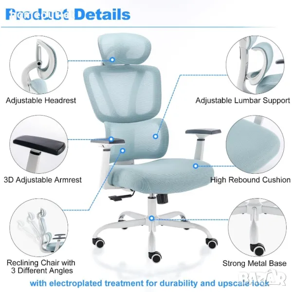 Облегалката и седалката на офис стола са изработени от дишаща мрежеста материя, която предотвратява досадното изпотяване, дори в горещи дни или при продължително използване.