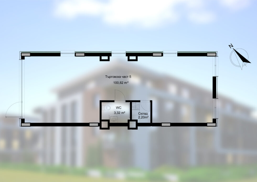 Разпределение: състои се от търговска част, WC и склад, с вход от улицата.