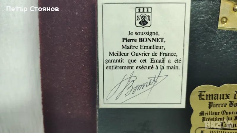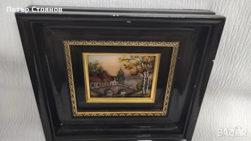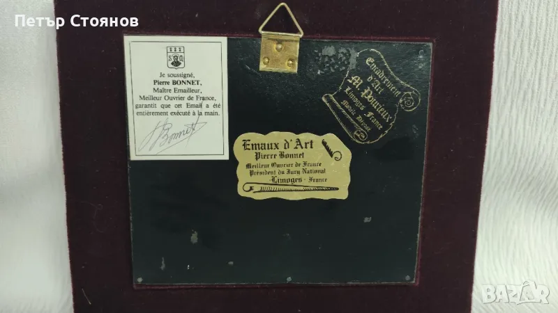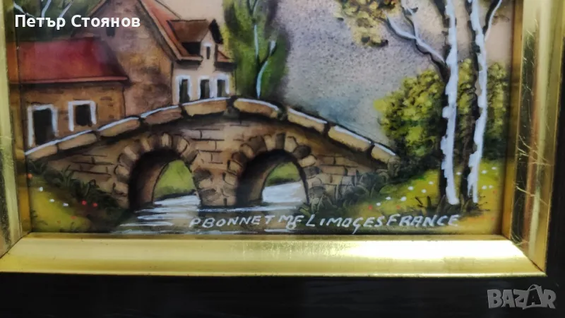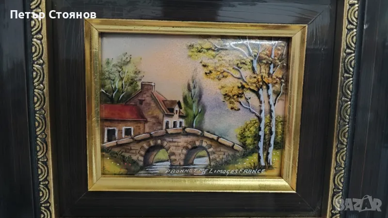 Предлагам чудесна френска миниатюра от вида Limoges. Изработена е в завода за порцелан на Лимож, преди около 30-35 години. Подобни миниатюри се изрисуват на медна плака и след това се изпичат и произведението получава гланц, като на порцелана. Купувана е в Париж на цена от 160 евро, представлява пейзаж. В отлично състояние е , въпреки годините и, има само съвсем леки забележки по рамката. на гърба има и залепени сертификати за произход и автентичност. Размери