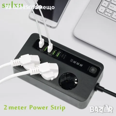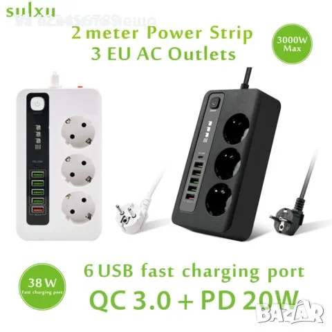 Висококачествен европейски разклонител с защита от претоварване, 3 AC изхода + 6 USB, с PD20W порт за бързо зареждане 2-метров кабел за разклонител