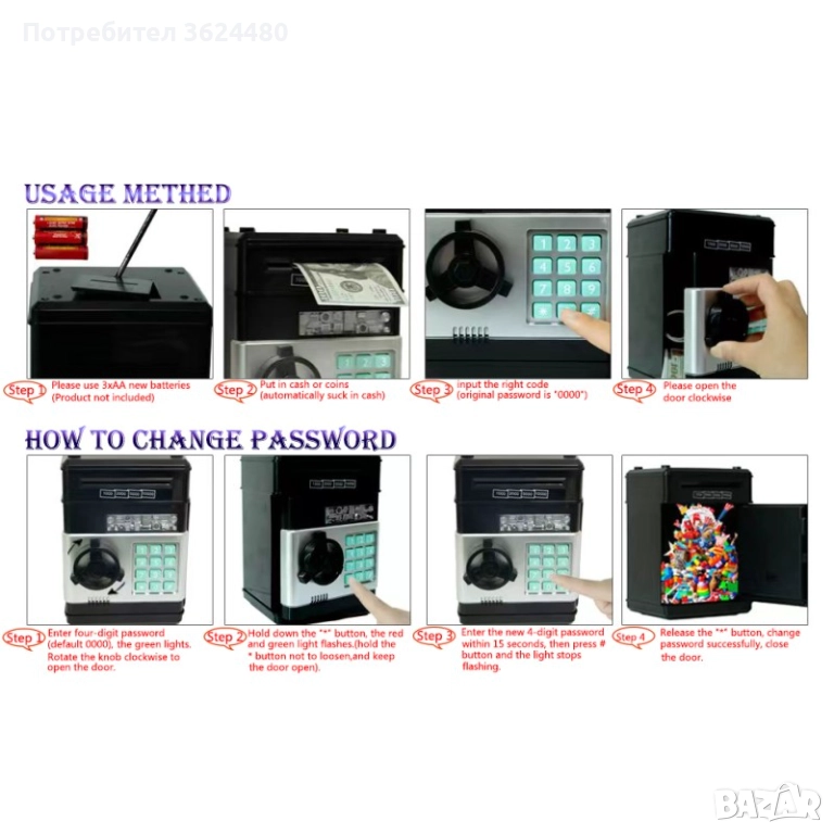 Светлинни и звукови ефекти: При успешно въвеждане на правилната парола, сейфът се отваря автоматично, придружен от светлинни и звукови сигнали