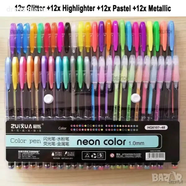 48 уникални цвята: Комплектът включва неонови, металикови, пастелни, брокатени и други ефектни тонове.