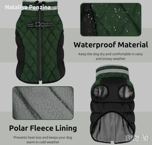 Защита от студ: нашето кучешко палто поддържа вашето куче топло. Мекият, леко еластичен дизайн на корема предлага на вашето куче максимална свобода на движение. Тъй като шията, коремът и областта на гърдите са напълно покрити, вашето куче не трябва да замръзва през зимата. Палто за куче с колан: Интегрираният колан ви спестява досадното търсене на допълнителна яка или колан. D-пръстенът е издръжлив, с по-голяма якост на опън. Ципът на гърба позволява бързо и лесно поставяне на зимното палто. Изключително мека подплата от полар: Палтото за кучета има особено висока яка и вътрешна подплата от мек полар, която предлага най-висок комфорт при носене в студените дни. В същото време светлоотразителната лента осигурява висока видимост в тъмния сезон. Водоустойчиво и ветроустойчиво яке за кучета през зимата: Зимното палто за кучета е изработено от водоотблъскваща полиестерна материя, вашето куче гарантирано ще остане сухо през зимата.