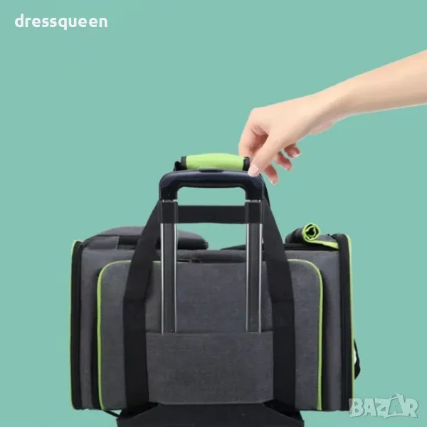 1. Голям капацитет, здрава и недеформируема вътрешност, облицована с опора от влакнеста пръчка, за да се гарантира, че чантата няма да се деформира. Бързо и удобно пътуване, широко зрително поле и преносим. Отворите с ципове от двете страни са удобни за влизане и излизане от домашни любимци и могат лесно да се сгъват. Чантата се фиксира върху куфара с колела.