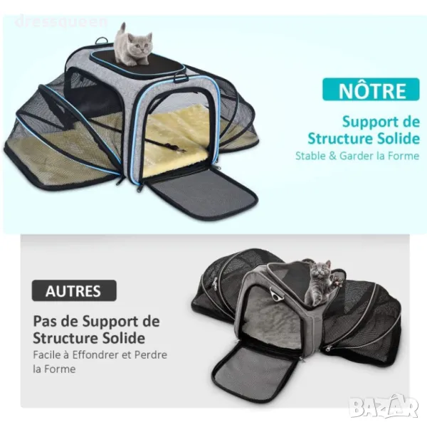 С компактни размери в неразгънато състояние – 45х30х30 см, чантата е лесна за съхранение и носене. Когато е разгъната, тя достига размери от 45х82х30 см, предоставяйки на вашия любимец повече пространство за комфорт по време на пътуването.