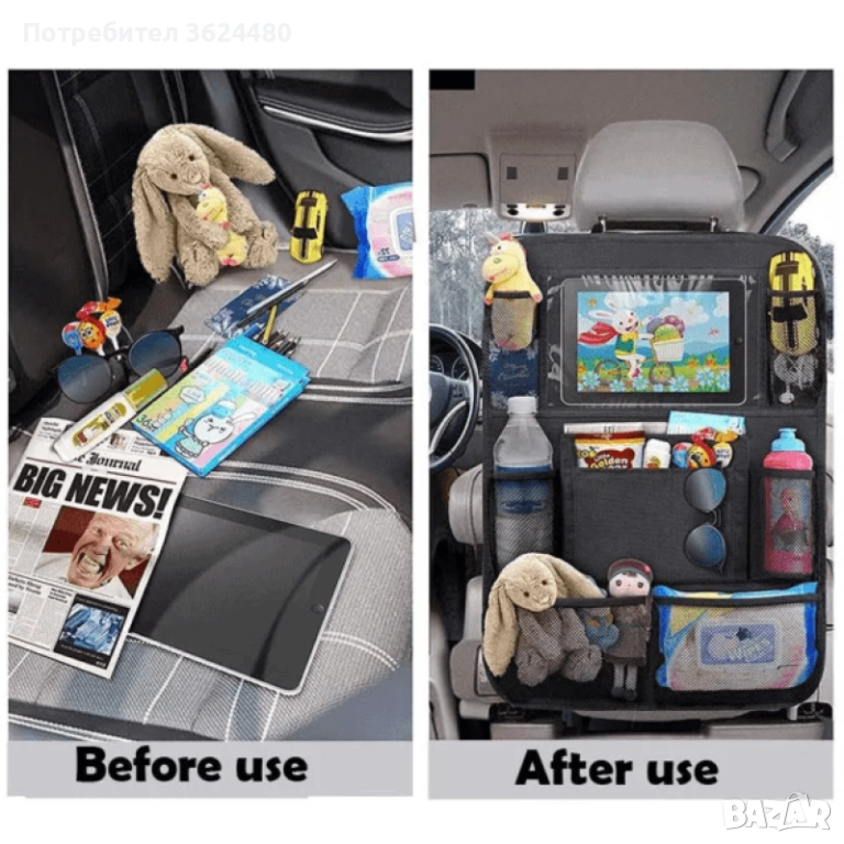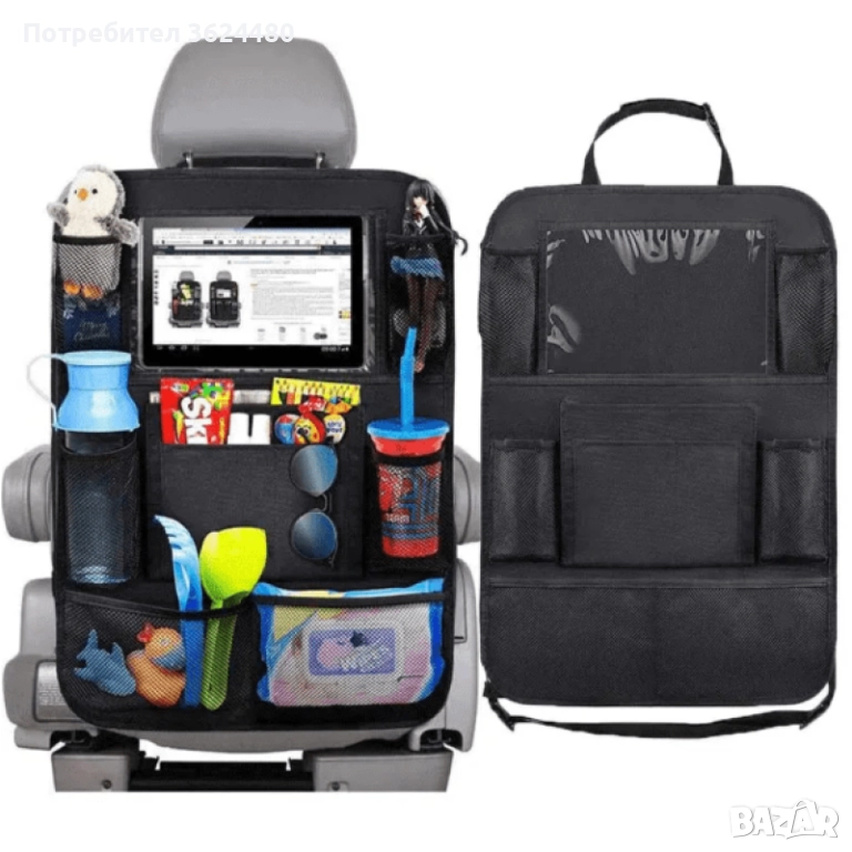 Този органайзер се отличава с голям капацитет за съхранение, предлагайки осем разнообразни джоба, подходящи за всевъзможни предмети, включително таблети, играчки, меки играчки, книги, списания, бираци, химикалки, бебешки бутилки, безалкохолни напитки, закуски, носни кърпички, кърпички и други.