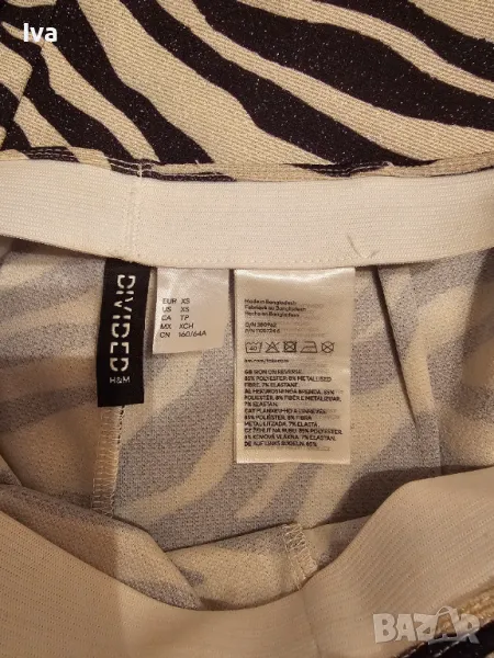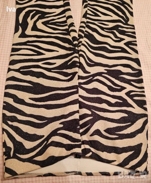 Дамски официален чарлстон панталон h&m, с тигрова шарка. Размерът на етикета е XS, но аз нося М и ми е добре. Доста еластичен; отгоре е с ластик; цветовете са черно и златисто, с лъскави нишки ( целият е лъскав). Размери: кръст - 33 см; ханш - 39 см; дължина отгоре до долу - 106 см. Пак казвам - много разтеглива материя. Носен два пъти, отлично състояние; даже не намирам следи от носене.